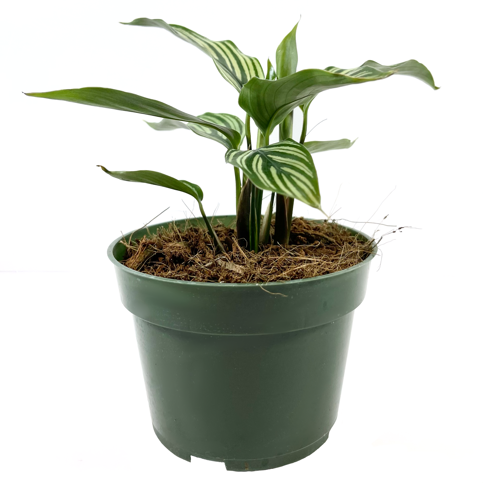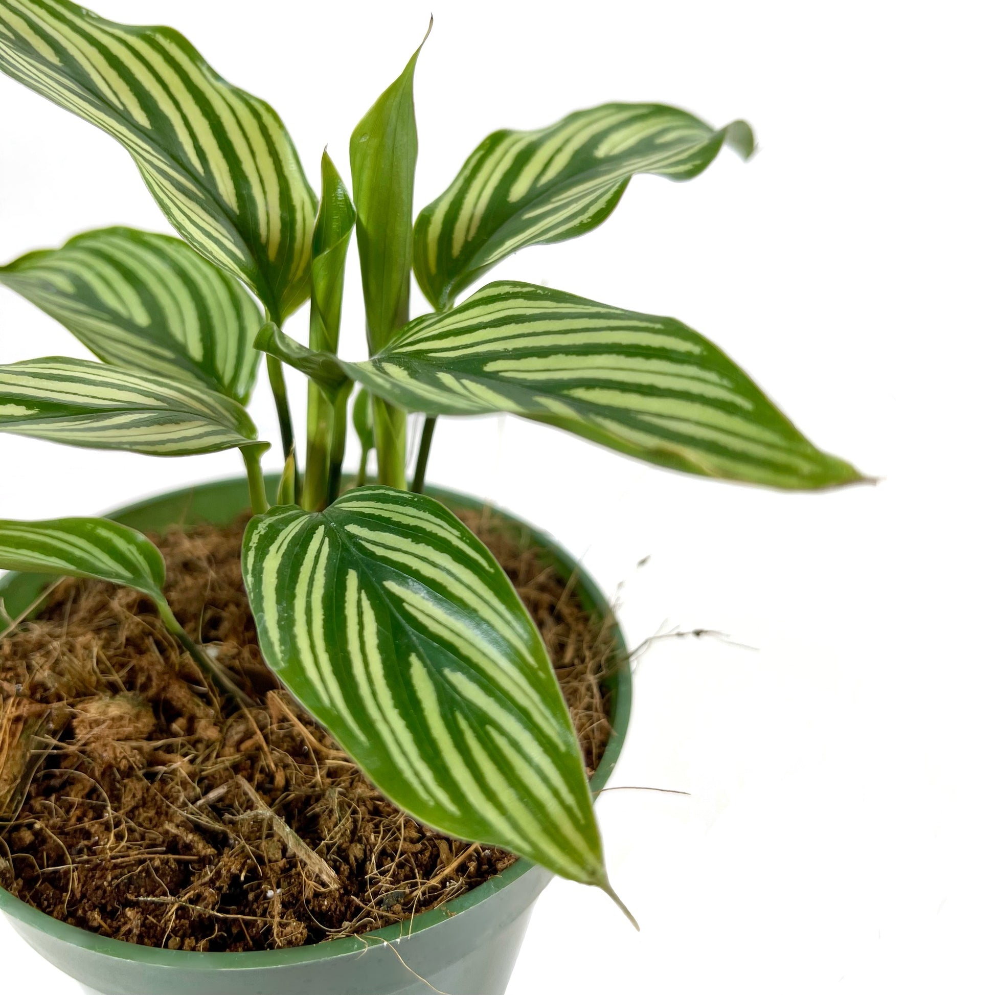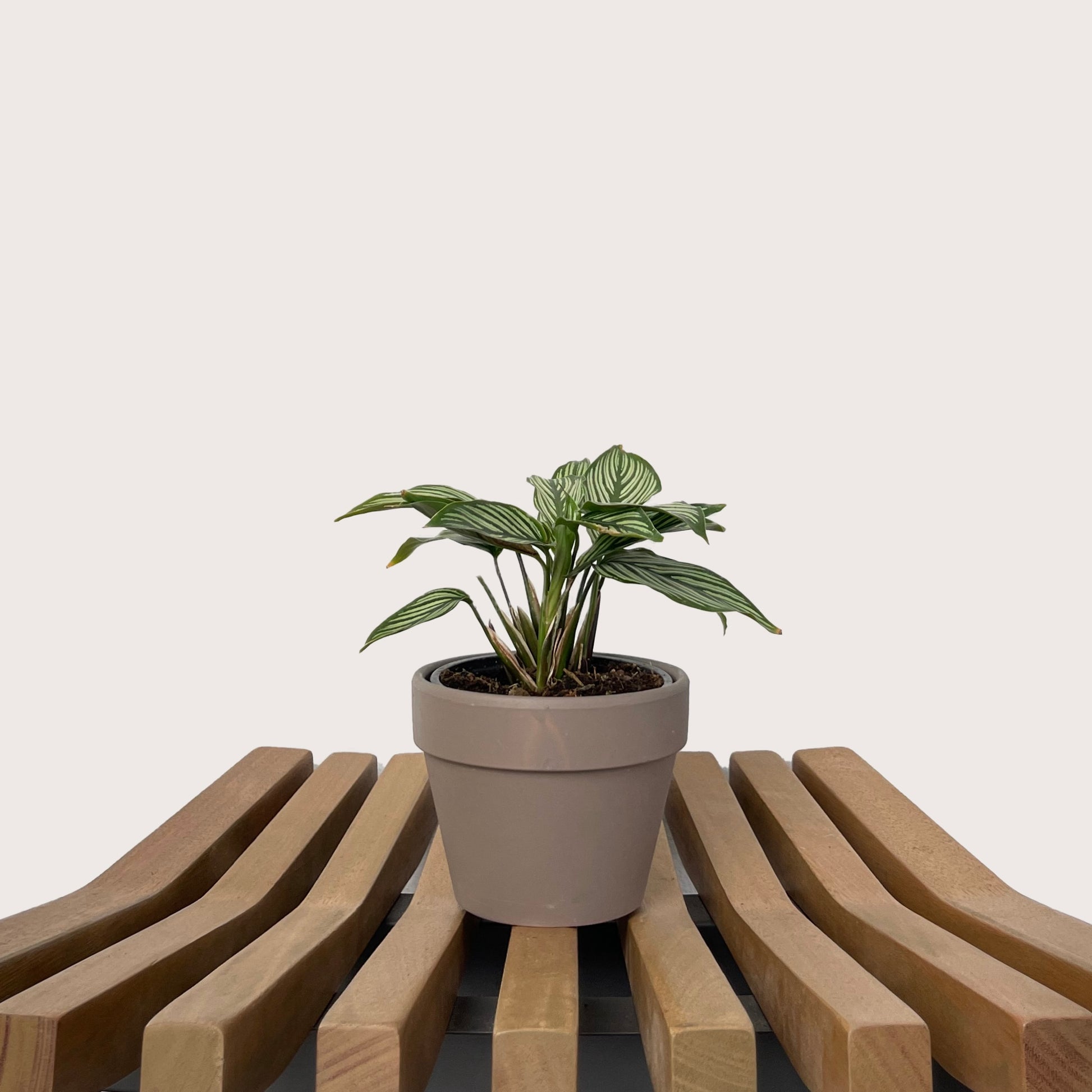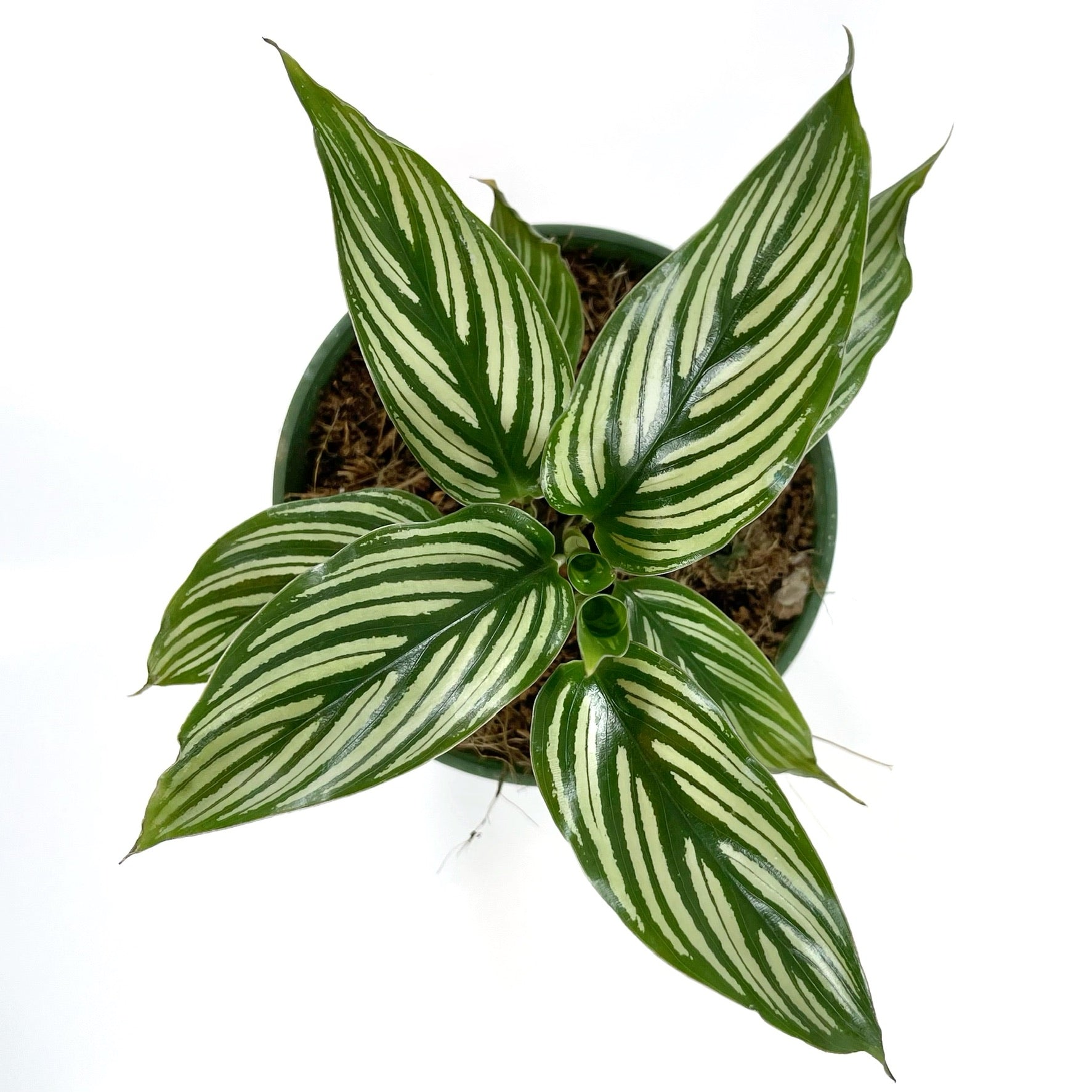 The Calathea Vittata is bright with green elliptical leaves featuring white stripes. It has a tailored look - simple and understated.