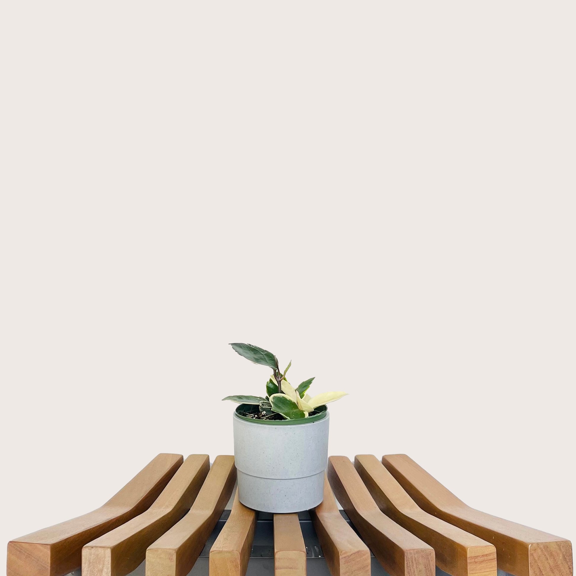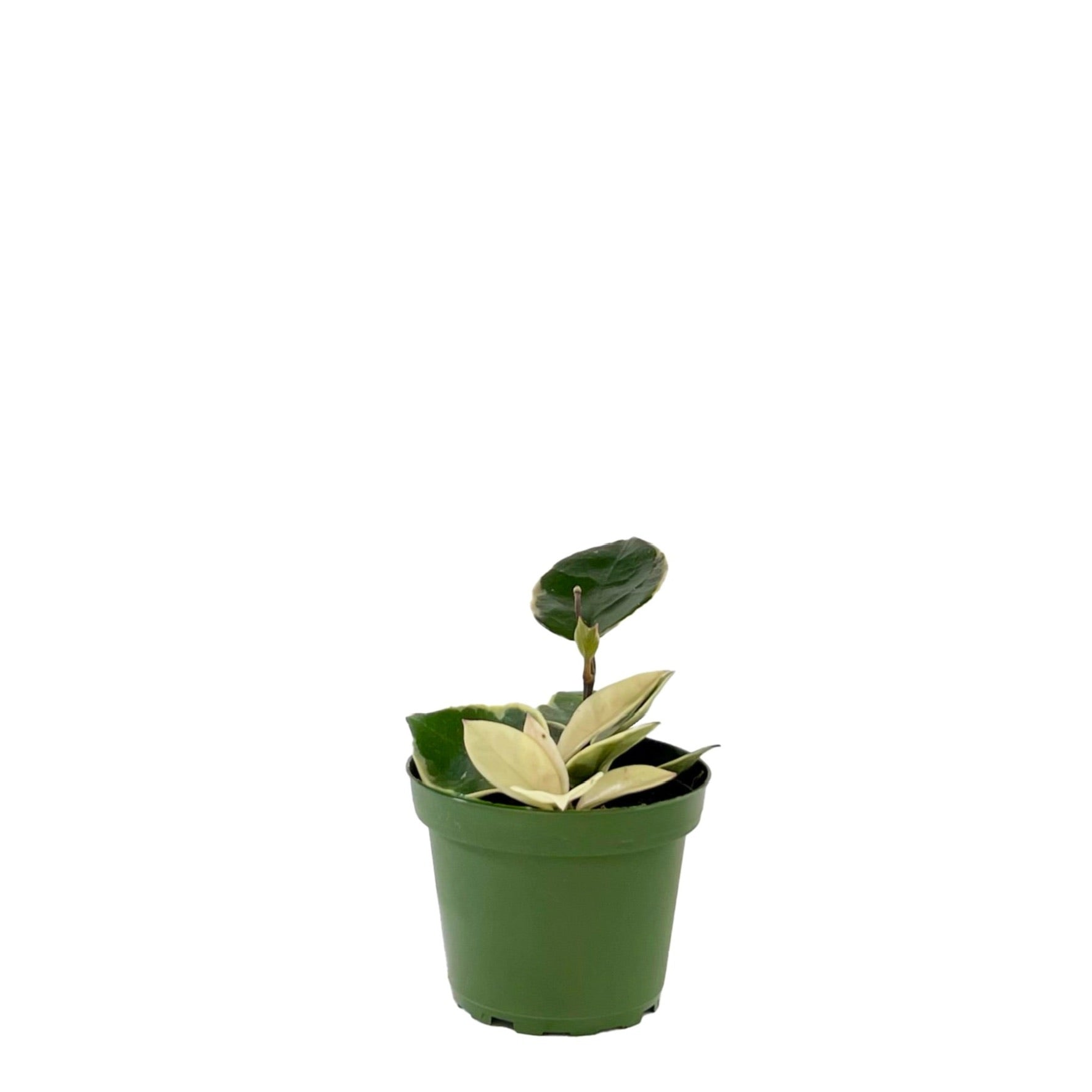 Hoya carnosa 'Krimson Queen' is a variegated cultivar of the Wax Plant. The Krimson Queen boasts white to pink variegation around the leaf margins. The plant's vines and new leaves often emerge bright pink, with the occasional leaf entirely white. The Queen grows long, winding vines and is an ideal choice for a trellis or hanging planter.