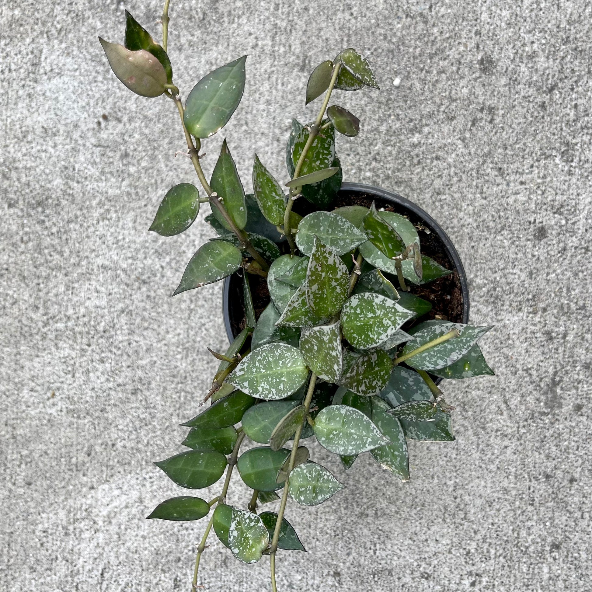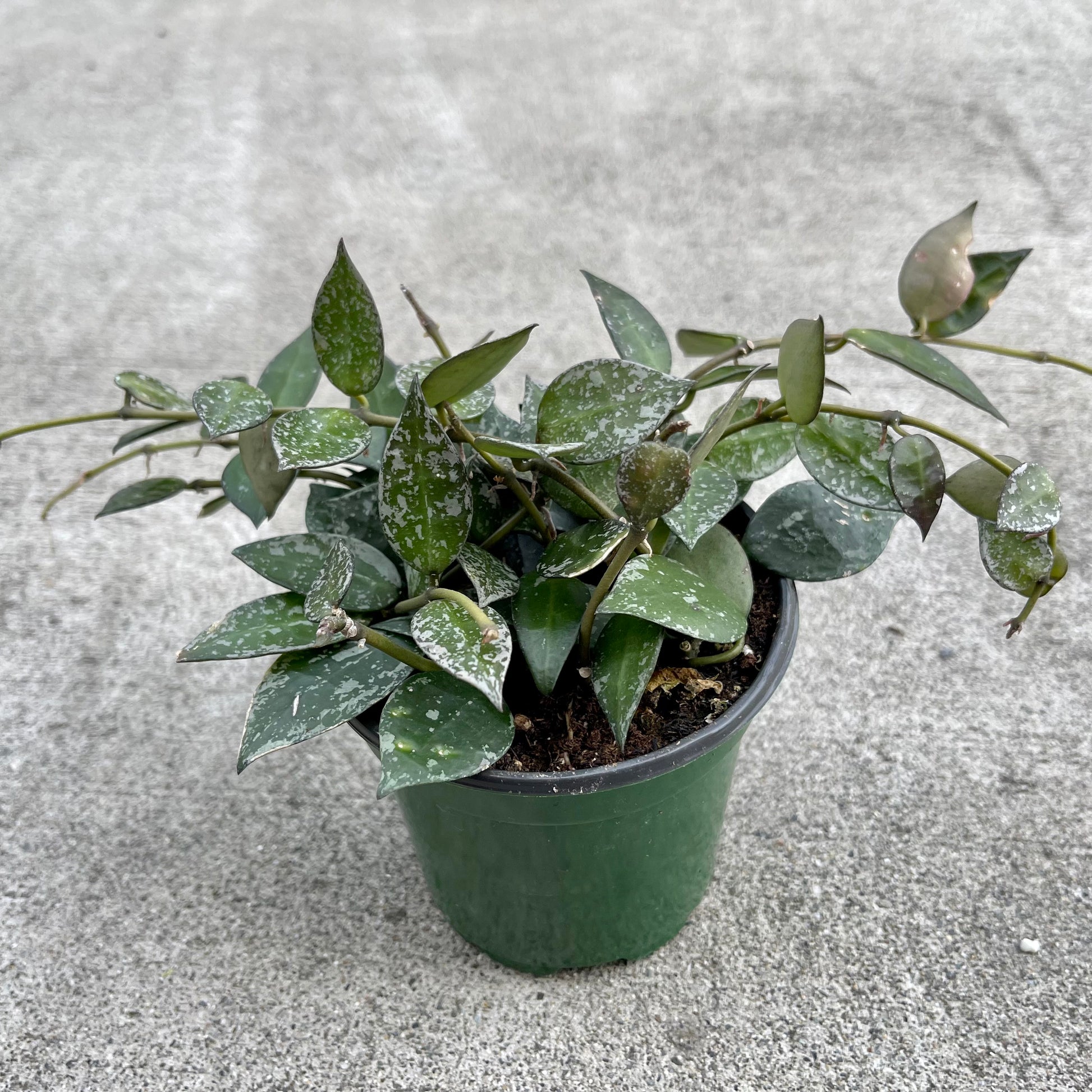 The Hoya Krohniana Silver Splash displays trailing, delicate silvery-green leaves. Similar to other Hoyas, this plant will eventually produce white flowers when mature.