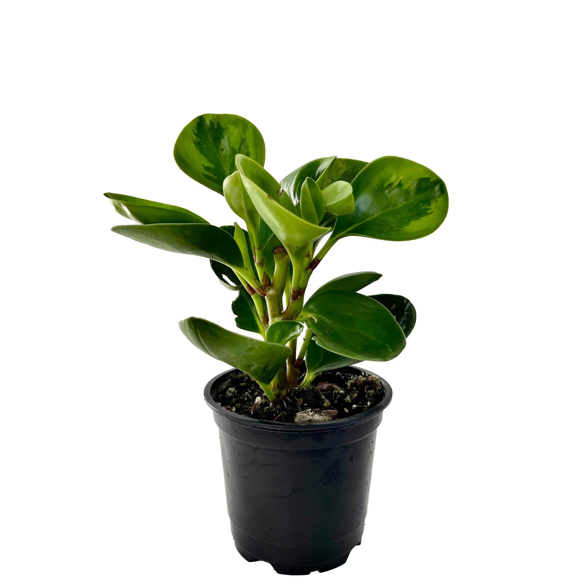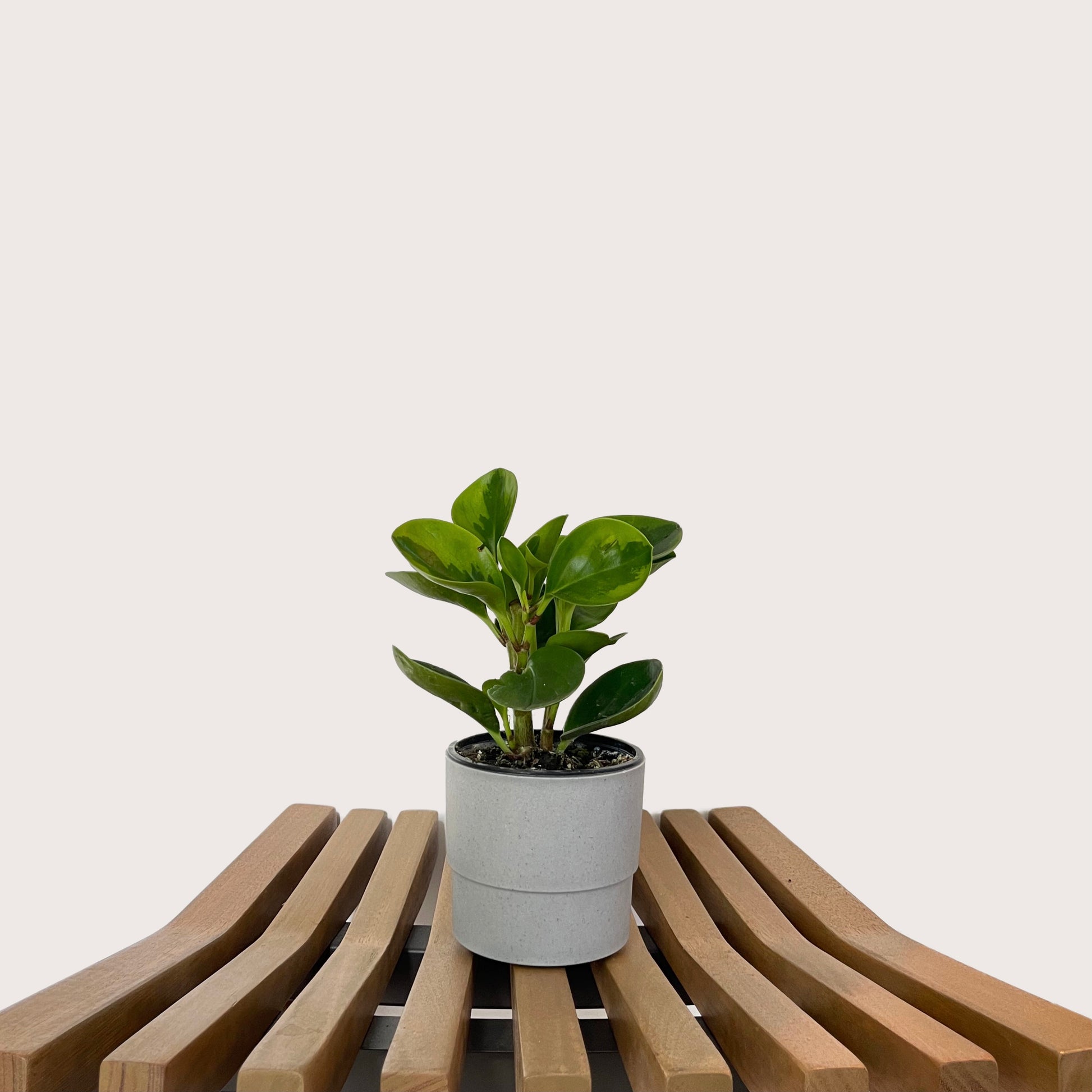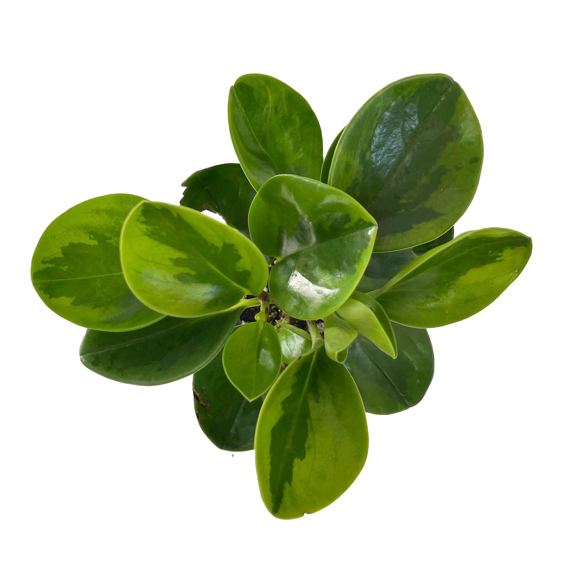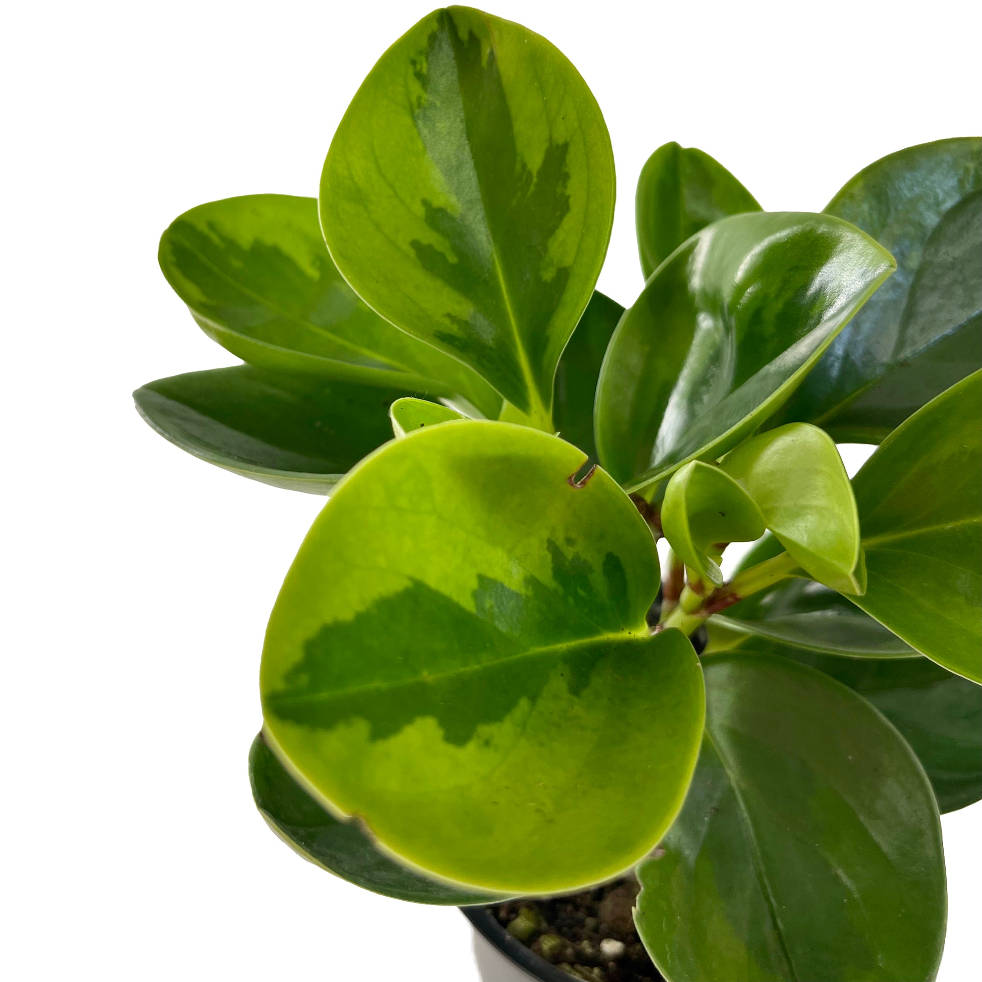This Peperomia variety has thick, wavy spoon-shaped leaves feature artistic green centers and cream colored edges, giving it a marbled look. It is a bushy, upright plant with thick stems and fleshy, glossy, cupped leaves. It has a compact, spreading nature and is particularly suited to growing in low or fluorescent light.